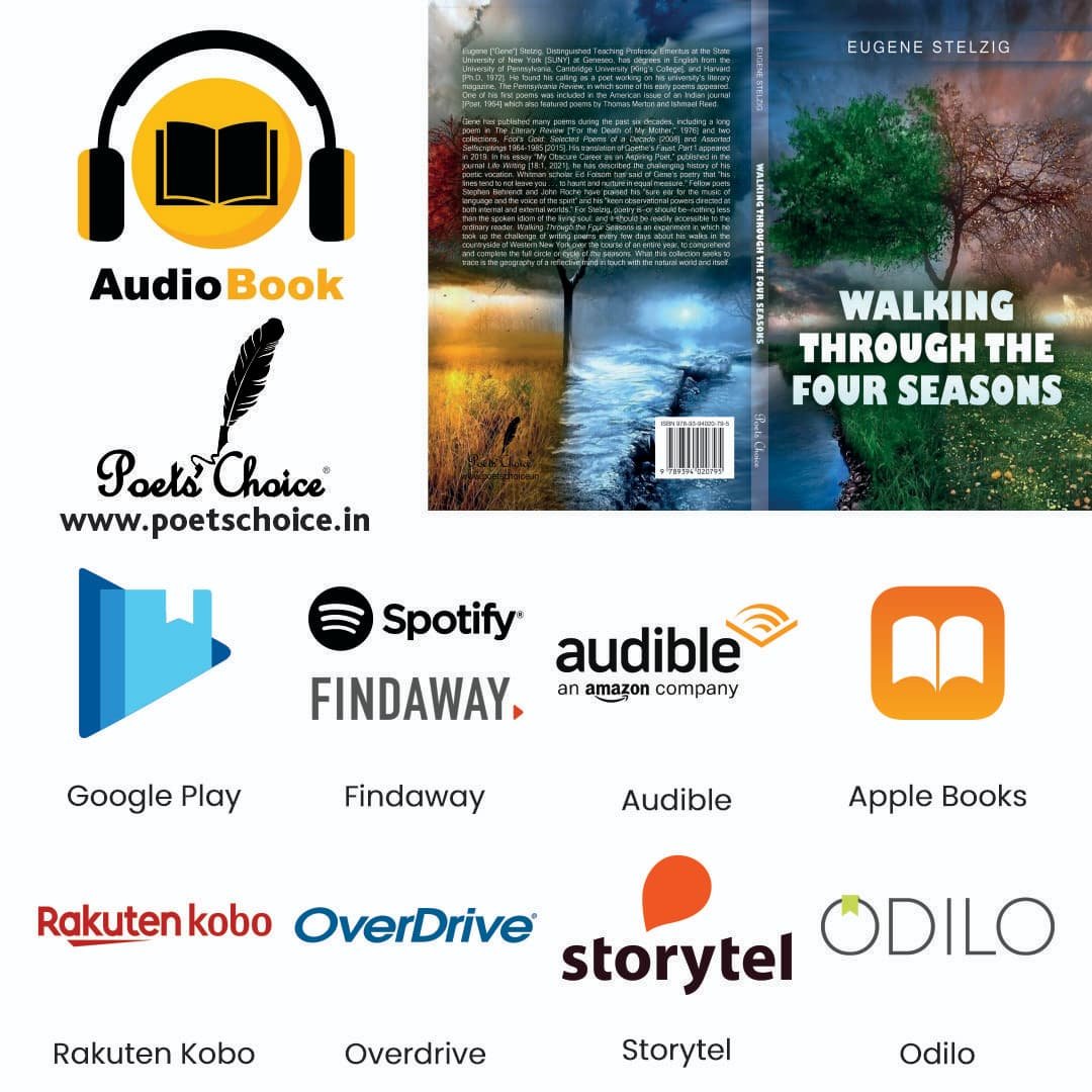 Eugene [“Gene”] Stelzig, Distinguished Teaching Professor Emeritus at the State University of New York [SUNY] at Geneseo, has degrees in English from the University of Pennsylvania, Cambridge University [King’s College], and Harvard [Ph.D, 1972]. He found his calling as a poet working on his university’s literary magazine, The Pennsylvania Review, in which some of his early poems appeared. One of his first poems was included in the American issue of an Indian journal [Poet, 1964] which also featured poems by Thomas Merton and Ishmael Reed.